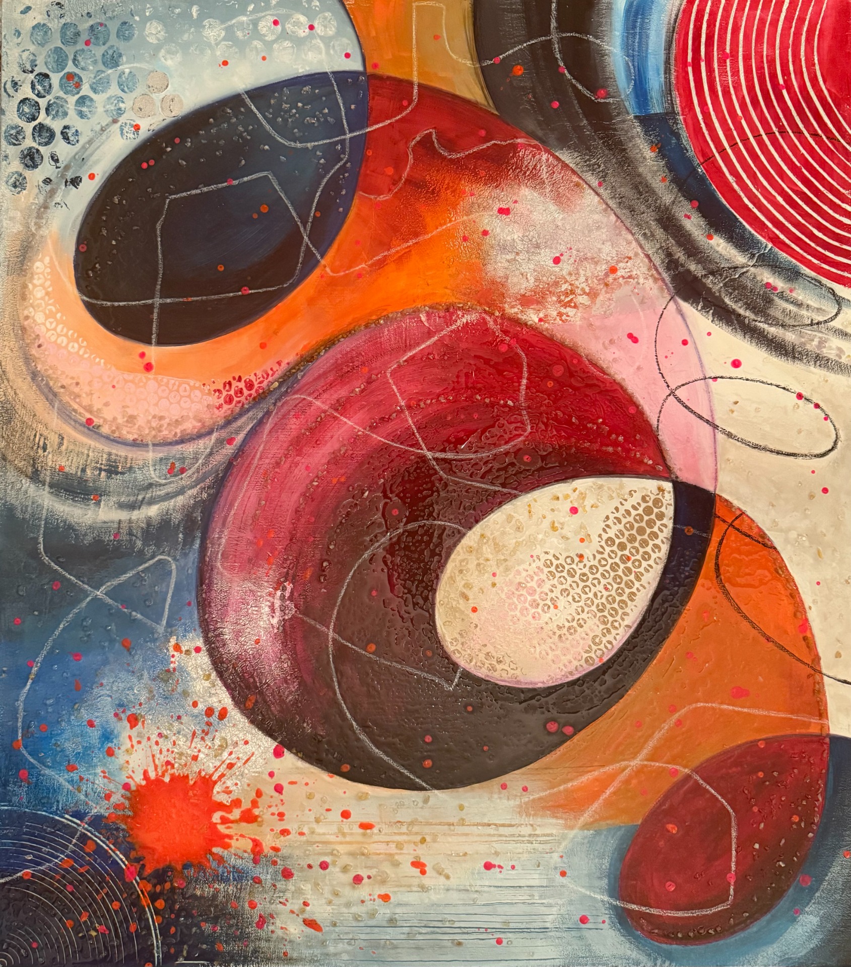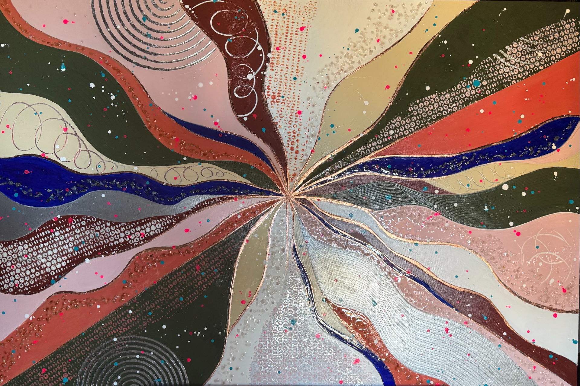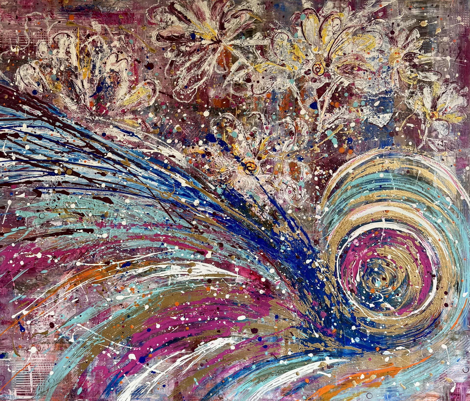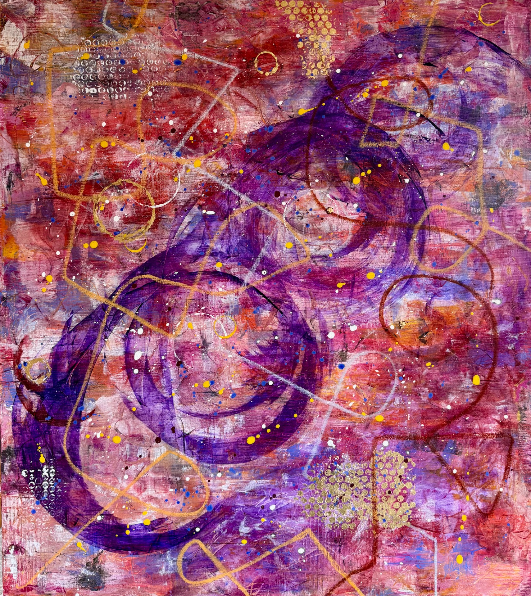 Acrilico su tela 80X90 cm, gesso, foglio d'alluminio. foglia argento, pastelli a olio, resina, pietre naturali: avventurina rossa, quarzo rosa, citrino e ametista.