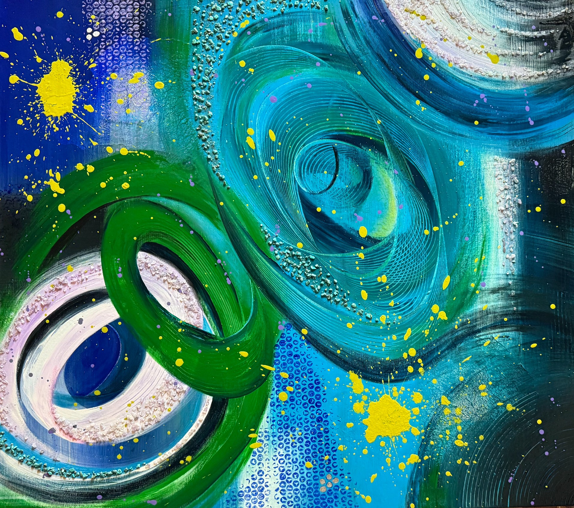 Acrilico su tela 80X90 cm, gesso, foglio d'alluminio. foglia argento, pastelli a olio, resina, pietre naturali: turchese e ametista.