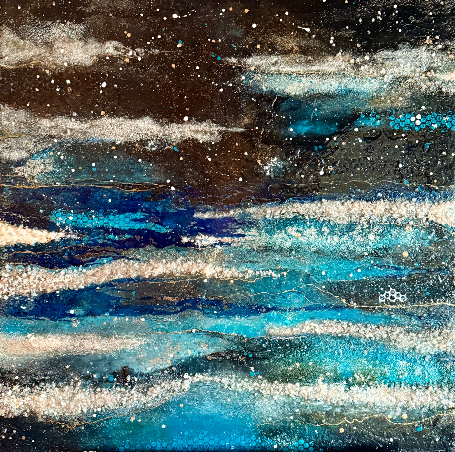 Tecnica: colori acrilici, base gesso, fogli d'alluminio, foglia argento, polvere oro, sale rosa Himalaya, resina trasparente