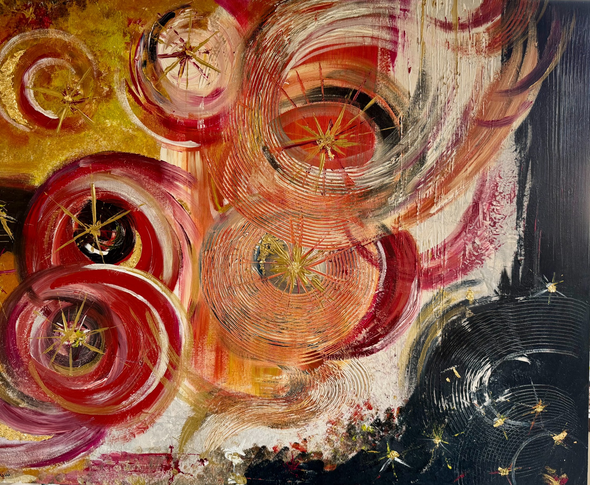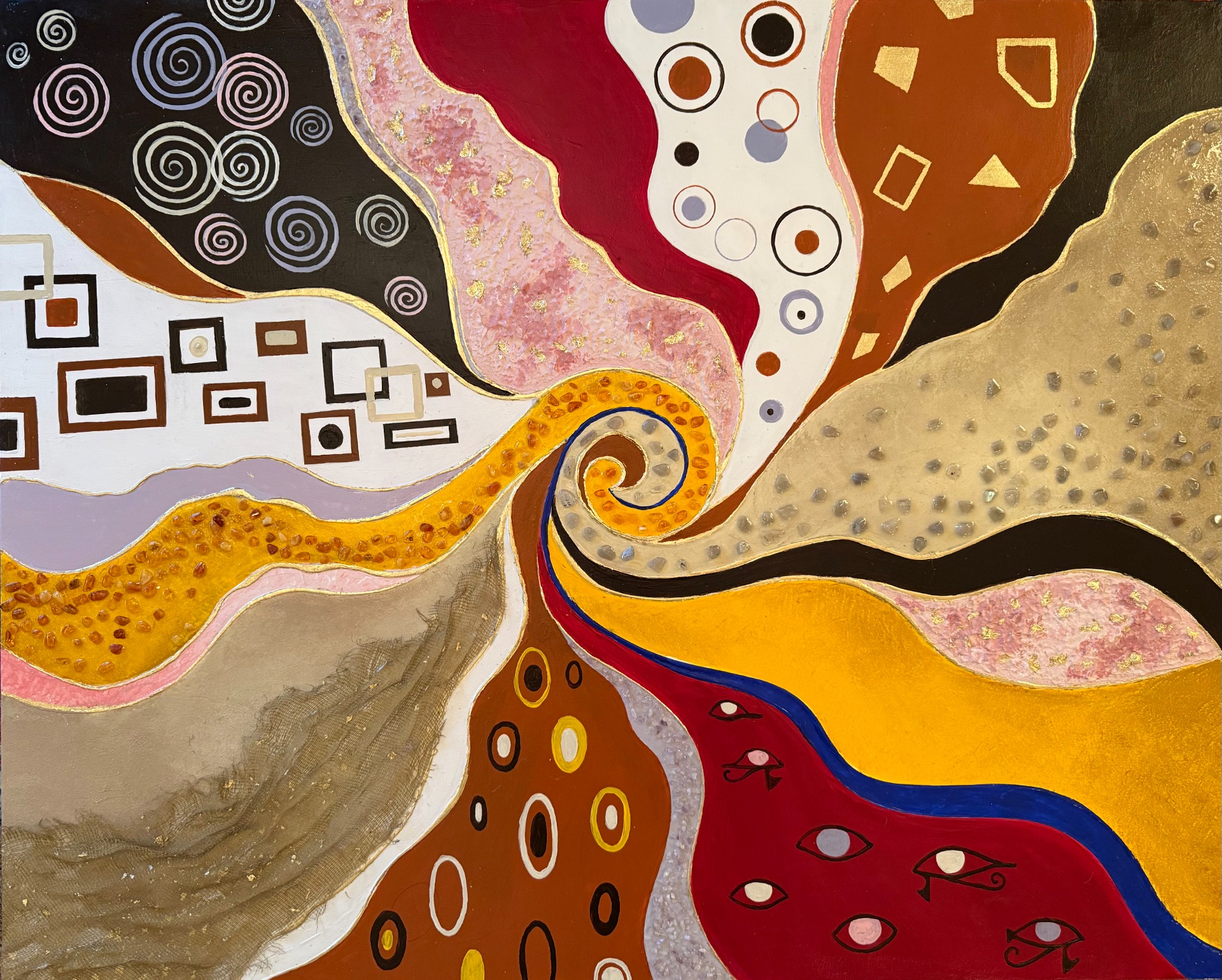 Tecnica: acrilico su tela, gesso, foglia oro, alluminio, resina, pietre naturali: avventurina rossa, lapislazzuli, quarzo rosa.