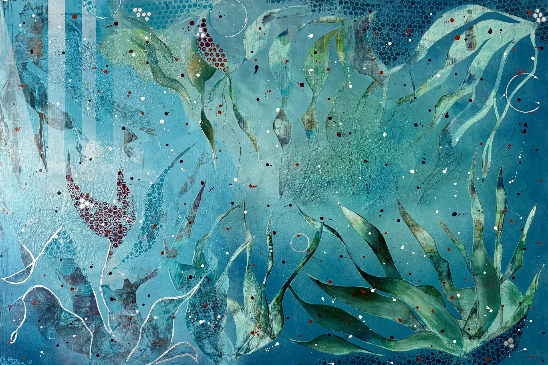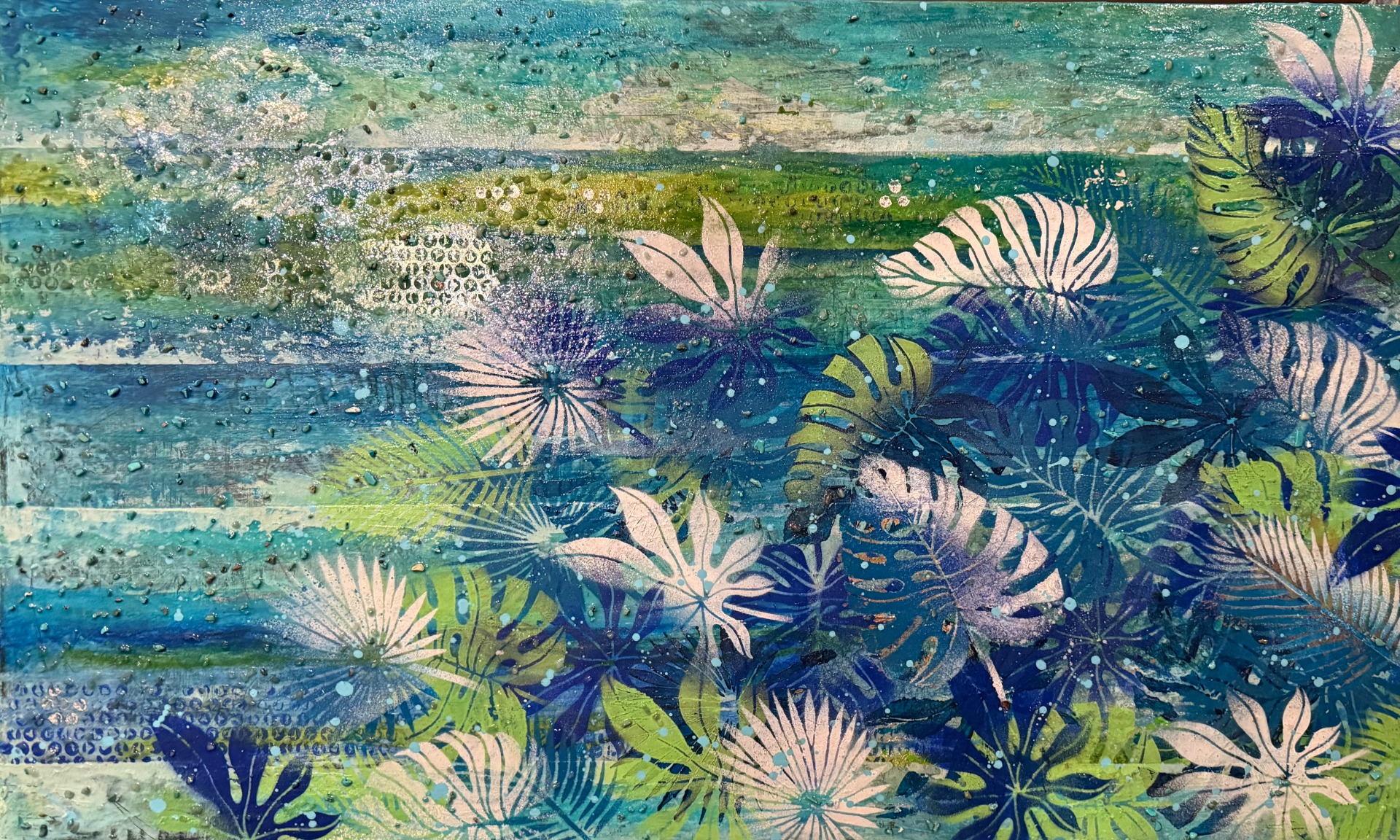 Tecnica: acrilico su tela, gesso 3D, foglio d'alluminio, foglia argento, resina trasparente, pietre naturali: avventurina verde e turchesi.